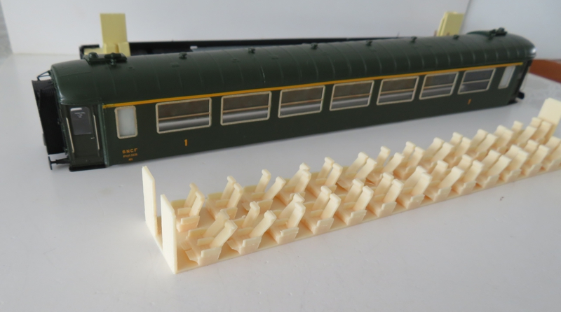Après le transkit d’EAD Postal sorti il y a quelques temps et toujours disponible, je vous propose sur le même principe un transkit permettant de reproduire une des célèbres voitures Fauteuil de la SNCF. Réalisées dans les années 50 par transformations de voitures OCEM et métallisées SE, plusieurs sous séries ont étés réalisées en 1ère et en 2ème classe. C’est un modèle construit en réalité sur une base OCEM-RA 1ère classe couchettes A10/2c10/2yfi que je vous propose. Ce modèle immortalisé par France-Trains et Jouef en HO n’étant plus vraiment aux standards actuels, j’ai pris comme base pour ce transkit une A8 OCEM RA LSM/Model Words, sans doute une modèle R37 peut-il aussi convenir. Il convient de raccourcir le chassis et la toiture de quelques mm pour obtenir la longueur voulue, la conception du modèle LSM s’y prête très bien. La ligne d’alarme en toiture doit être supprimé. Il doit être aussi possible de travailler à partir du modèle France-Trains Jouef sans garantie de correspondance dimensionnelles des pièces fournies dans mon transkit.