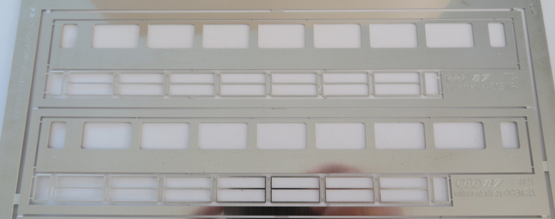 Le transkit est composé de deux flancs de caisse photogravés en maillechort de 0,5mm, deux plaques de vitrages découpés au laser qui servent de rigidifiant aux flancs photogravés, un ensemble d’encadrements de baies photogravés en maillechort et une planche de décalcs permettant de réaliser des versions époque 3 avant et après 1956 et époque 4 UIC y compris les bandes de classe. (le marquage du modèle en photo n’est pas le bon, il a été utilisé en attendant le tirage de série). L’aménagement intérieur n’est pas fourni, il est commercialisé par mon confrère Modélisme-Collection sous forme d’une pièce imprimée en 3D filaire.