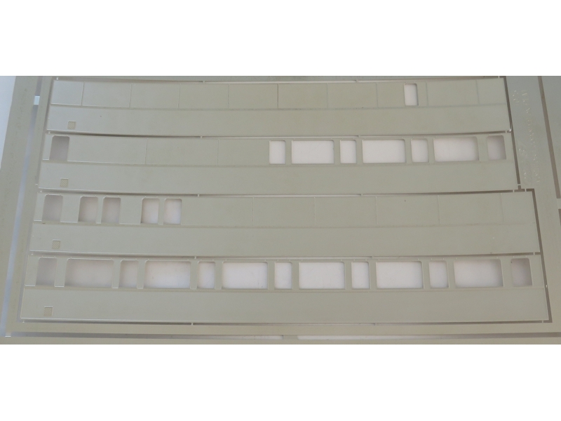 Le transkit est composé de 4 flancs de caisse photogravés en maillechort de 0,5mm, deux plaques de vitrages découpés au laser qui servent de rigidifiant aux flancs photogravés et une planche de decalcs permettant de réaliser des versions époque 3 et époque 4 UIC, marquages EX puis T. Les modèles de base à utiliser sont les A7 et B8 métallisées PLM/SNCF REE, une de chaque est nécessaire (longueurs différentes).